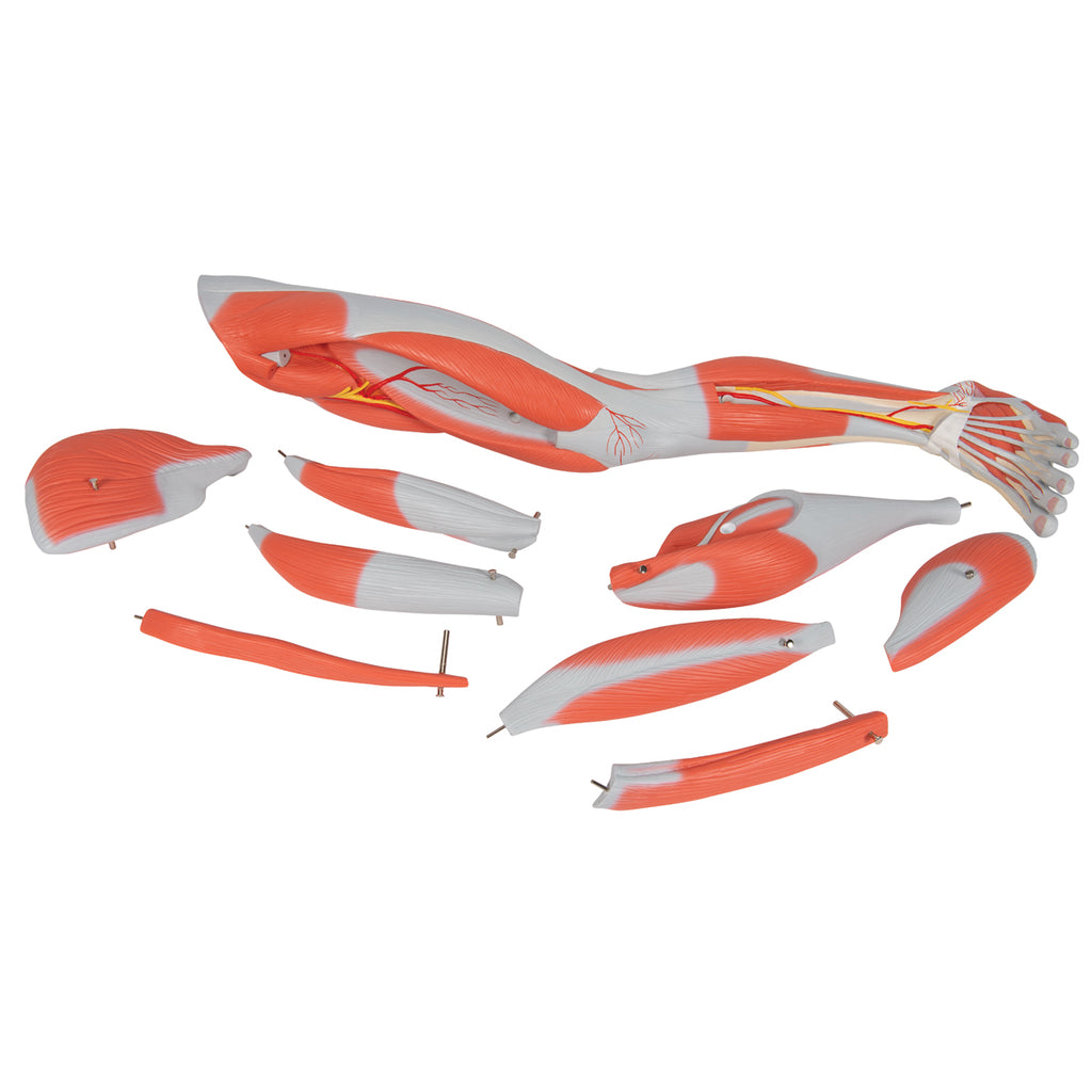 The muscular leg model illustrates both the superficial and deeper muscles, eight of which are removable. Tendons, vessels, nerves and bone components of the left leg and foot are shown in great detail in the muscular leg. Muscular leg delivered on removable stand.